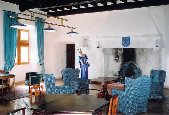 A droite de l’entrée du château nous pénétrons dans la grande salle éclairée au nord par une fenêtre à meneaux et au sud par trois petites ouvertures. Cette pièce de 9 mètres de long a une grande cheminée très simple, sans motif de décoration, avec à l’intérieur l’ouverture d’un four à pain. Le plafond en poutres et solives larges a été reconstitué fidèlement dans sa forme antérieure.