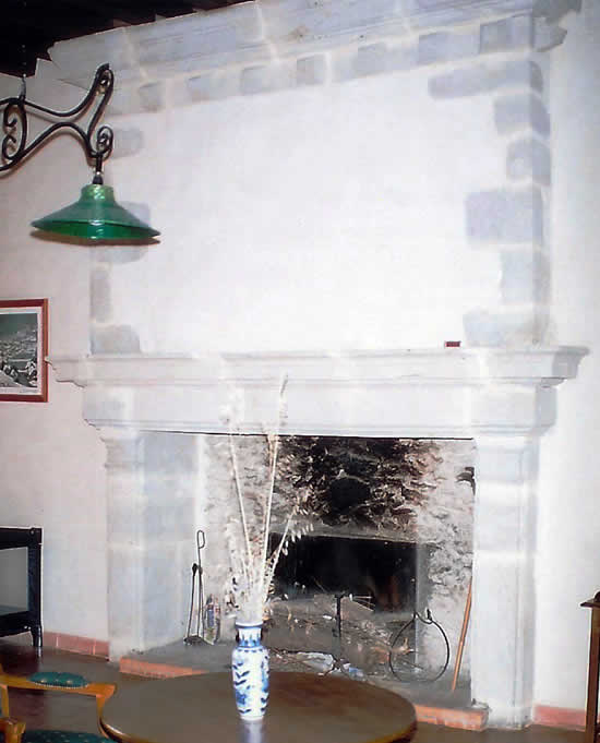Si nous entrons dans le château par la porte ancienne surmontée d’une bretèche, nous avons à gauche l’ancienne cuisine avec une grande cheminée du XVIIe siècle en pierre du pays à bossages. Le plafond en poutres apparentes et chevrons date de la même époque ainsi que le mur à colombages délimitant l’arrière cuisine maintenant transformée en chambre.