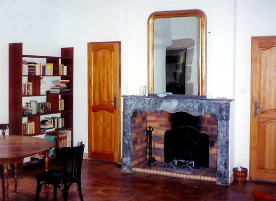 A gauche, sur le palier du premier étage, nous entrons dans le grand salon éclairé par trois fenêtres à meneaux, deux au sud d’où l’on voit les Pyrénées, une au nord d’où l’on voit la Montagne Noire. Cette grande pièce de 65 m2 possède une grande cheminée sans fioriture qui était recouverte de plâtreries du XVIIIe siècle d’inspiration romaine. Ces décors en mauvais état ont été démontés et conservés par ailleurs, laissant apparaître la cheminée dans son état initial. Sur le mur nord, nous avons découvert une ancienne ouverture, murée par la tour de l’escalier à vis, donc très antérieure. Sa forme particulière, avec deux supports de linteaux arrondis qu’on retrouve partout dans la Cité de Carcassonne, autorise une datation du XIIIe siècle que l’on peut sans doute attribuer également à la cheminée voisine.