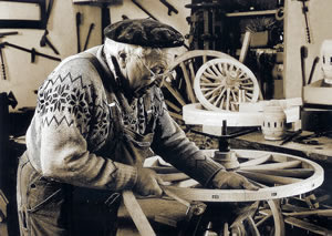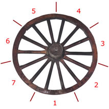 A l'aide d'un repère gravé, la roulette sert à mesurer la circonférence des roues pour préparer les bandages en fer.