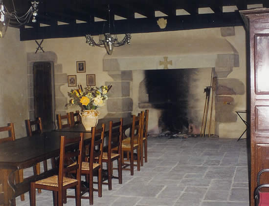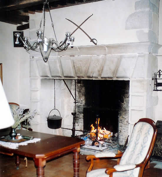Si nous entrons dans le château par la porte ancienne surmontée d’une bretèche, nous avons à gauche l’ancienne cuisine avec une grande cheminée du XVIIe siècle en pierre du pays à bossages. Le plafond en poutres apparentes et chevrons date de la même époque ainsi que le mur à colombages délimitant l’arrière cuisine maintenant transformée en chambre.