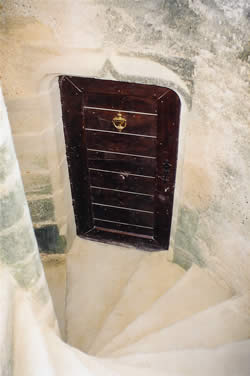 Dans le fond de cette salle, une porte avec moulures en pierre donne dans l’escalier à vis du XVe siècle situé dans la tour nord-est. Il conduit au sous-sol dans un « cachot » et au premier étage dans le grand salon.