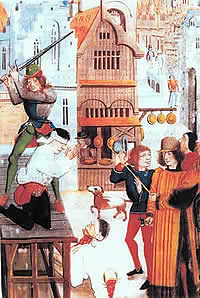 « …il sera dit que pour punition et réparation des cas crimes et maléfices commis et perpétrés par ledit Ste Colombe la Cour l’a condamné et condamne etre mis sur une charrette ou tombereau et lié et attaché faire le cours par les rues et quarefour a coustumes de Tlse…et apres estre mis au pillory et illec avoir le poing droit coupé lequel sera mis et cloué à un pal au lieu appelé de Saint Roque… »